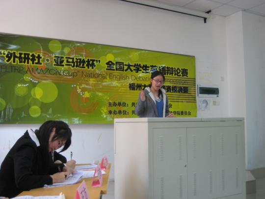 主持人正式宣布比赛开始,各位参赛的选手就坐完毕后,正反双方一一陈述了自己的观点。第一场的比赛进行了四十多分钟,参赛人员走进观众席等待结果。接着,第二场比赛开始,辩题也随之变换了,第二场辩论达到了高潮,精彩再次升级,他们一口流利的英语使在座的许多同学都投去崇拜的目光。经过两轮的精彩角逐之后主持人宣布比赛成绩,来自八方物流学院的石翰和许丽丽凭其精彩的表现夺得第一名,电影天堂