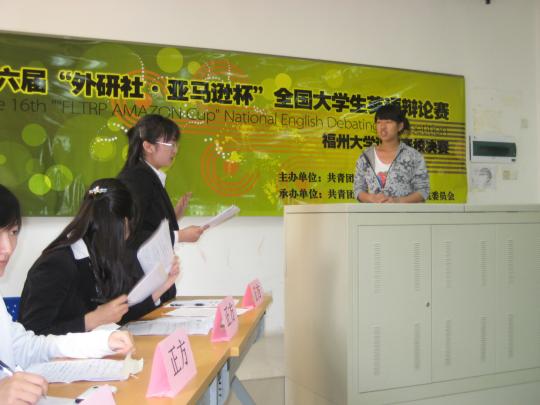 承办的第十六届“外研社.亚马逊杯”全国大学生英语辩论赛决赛于西2-303拉开帷幕。此次辩论赛共有四支来自不同学院的队伍参加。参与此次辩论点评的评委老师有梁向辉、付磊及林菲。