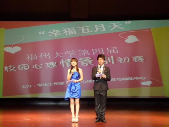 第四届心理情景剧预赛(第一场)在图书馆博学厅举行。此次大赛的主办单位是学生工作部(处)心理健康教育与辅导中心,承办单位是物信学院心理健康教育中心,协办单位有物信学院团委学生会心理部、宣传部、记者团,物信学院11级信息工程1班、微电子2班及光电班等。大赛还邀请了电影天堂