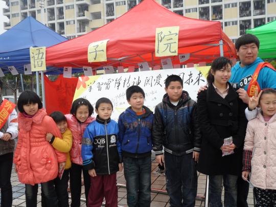 青协的志愿者请来了美岐等小学的孩子们,组织他们共同唱“学习雷锋好榜样”。通过一些小游戏、小活动,小学生们了解到了雷锋的事迹,达到了弘扬雷锋精神的目的。