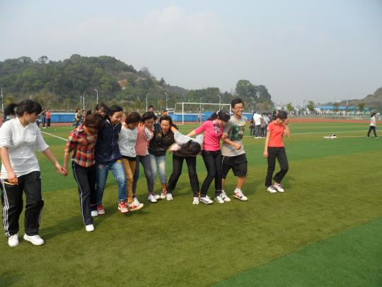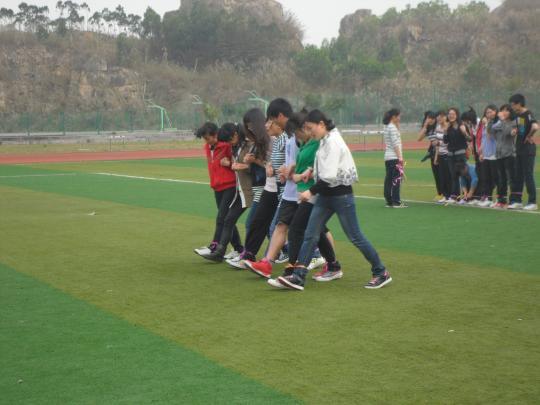 下午3时许,班级比赛开始。垫排球、跳大绳、8人9足比赛吸引了许多同学前来为班级加油助威。其中,8人9足比赛给记者留下了深刻的印象。它是一个对选手间配合度的大考验。选手们肩并肩,手勾手,在宽阔的足球场上来回训练着,脚步逐渐由生涩凌乱到熟练整齐。虽然在比赛中有时出现了一些小失误,但选手们仍相互鼓舞,奋勇拼搏。