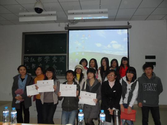 PPT展示正式开始。46名党员积极分子被分为6组,每组各派一名代表,就小组所推荐的红书进行讲解和展示。各个小组风采各异。有的选手,做了充分的准备,对红书内容剖析得深入浅出;有的选手侃侃而谈,从容自信;有的选手声情并茂,把枯燥苍白的文字展现得绘声绘色。其中党在故我小组的王馨楠同学激情澎湃的讲解引得现场观众阵阵叫好,她精彩的演绎不仅让人热血澎湃,而且让人觉得仿佛回到了那段历史,那个年代,遇见了那个顽强不屈的江姐。星火队的队员以欢快俏皮的语气为观众们介绍《狼图腾》一书,展示了内蒙古草原上傲视群雄的狼群不为人知的一面,给在场的观众留下了深刻的印象。在第二环节党史知识竞答环节中,各队选手你追我赶,展示了各自深厚的党史知识。活动最后评出一等奖一组,二等奖两组,三等奖三组。党在故我在小组夺得了桂冠。