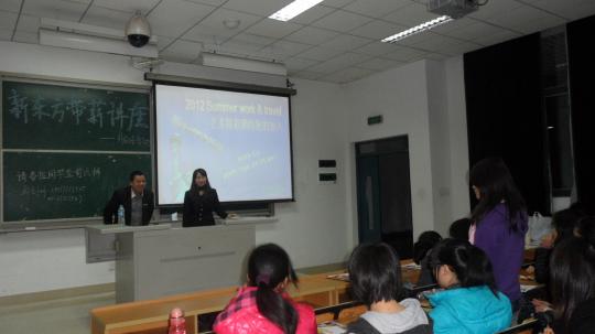 主办、福州新东方学校承办的新东方暑期带薪实习讲座在文一105圆满举行。此次宣讲会由新东方工作人员担任主讲,主要针对2012年暑期带薪赴美实习项目进行讲解,旨在通过此次宣讲会为同学们提供暑期实践的机会。