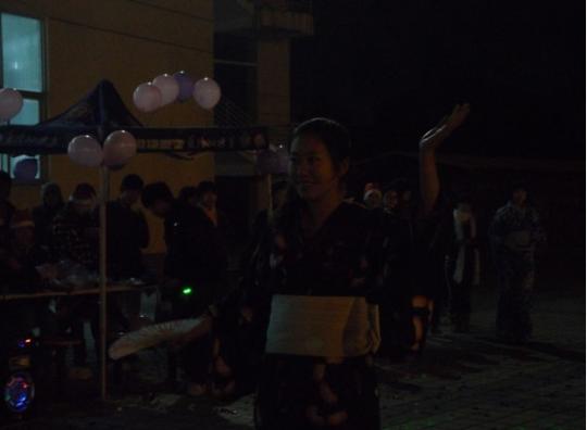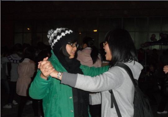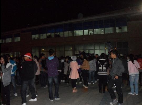 的男生也倾情献唱。《春天》、《Pieces》和他们改编的《Jingle Bells》,在富有磁性的电吉他声中,为伫立在寒风中的观众们送上了温暖的气息。樱花日协的舞蹈表演也让人眼前一亮,赢得了现场观众的阵阵叫好。接着,飞扬舞协会教观众们跳恰恰舞。富有激情的旋律将舞会气氛推向高潮。不少同学起初有些害羞,但抵挡不住音乐的感染力,跳舞的人群逐渐壮大。周杰伦的《彩虹》让不少同学牵起舞伴的手,随着柔美而深情的音乐踱步、旋转。轻松愉悦的《快乐崇拜》、俏皮可爱的兔子舞更是让广场上空笑声不断。21时30分左右,主持人宣布舞会结束,人群才恋恋不舍地散去。