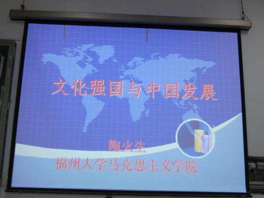 首先主持人对黄老师作了简要介绍,伴随着一阵热烈的掌声,黄老师走上讲台以“我自横刀向天笑,去留肝胆两昆仑”一句振奋人心的诗歌引入讲座的话题。他先从古人着眼道明中国古代文化悠久的发展历程,以及政治、经济、文化之间密切的联系,从而强调文化的重要作用。他还从“师夷长技以制夷”分析道出中国文化发展的血泪史,从而提出现在的人们不应该过分专注于物质文化的发展,而忽视精神文化的作用。