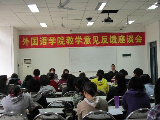 本次座谈会遵循各抒己见,友好沟通的原则,紧紧围绕学生学习,教师教学两方面开展。三个语种分三批按年级进行了沟通交流。德语系的四位学生代表首先反映了各年级学生普遍关心的问题,其中,关于德语系教师同时任教机械学院、土木学院导致德语本系教师资源不足等问题反映尤为强烈。学院领导对该问题进行了回应,表示会采取措施、尽全力支持本院德语教学。随后,日语系也陈述了本专业教学存在的问题,一些学生代表认为本专业部分课程重复且没有新意。学院领导首先对此表示理解,随后也表明语言领域的教学很大程度上会有重复内容,今后将在工作中大力创新,进行全方位教学。最后,英语系提出本专业部分教学材料应用不够合理,其中21世纪报争议比较大。学院领导表示,英语专业学生应该灵活利用各种材料来充实提高自己,并建议即使是死板的报纸也应读出其精髓。