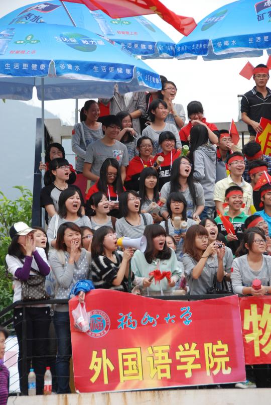 个项目的角逐。在大本营区,各个学院展出了具有学院特色的展板,打出为运动员加油助威的标语,拉拉队的欢呼声此起彼伏,运动场上气氛十分活跃。