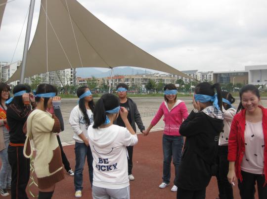 所有的队员手牵手结成一张网,要以最快时间不松手地形成一个圆)”、“盲人方阵(让所有队员被蒙上眼睛,在十分钟内,将一根绳子拉成一个最大的正方形,并且所有队员都要均分在四条边上。)”、“信任互坐(组员围成一圈,并且互相坐在后者的大腿上,以时间定胜负)”和“搭桥过河(利用有限的报纸让所有的队员到达终点,不能踏出报纸)”。在玩游戏的寓教于乐的过程中,参与者的团队协调性和团队精神得到了很大的锻炼,活动的气氛也被调动地越来越热烈。最终,活动圆满的结束了,组与组之间没有胜败之分,只有精神上丰硕的收获。