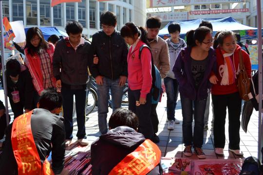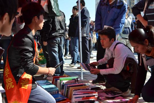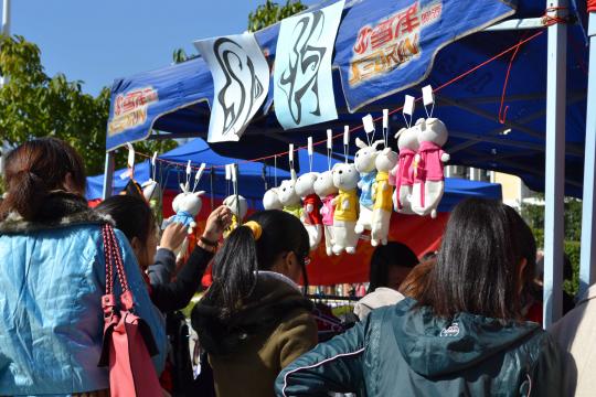 ,各学院也都煞费苦心,志愿者们积极地向路人推荐自己的商品,还未等路人靠近,热心的志愿者们便开始了叫卖,广场上的气氛不断升温。冬日的阳光暖暖地照着,一股暖流在买卖者之间涌动。