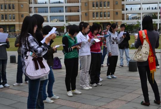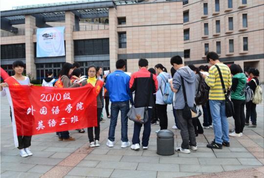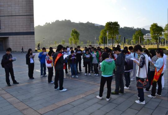 10级英语3班团支部携手管院口协在图书馆前的福万广场举办了为期一周的晨读倡导活动。此次活动以倡导福大学子积极学习英语为目的,通过晨读搭建英语专业学生和非英语专业学生共同学习的平台,把英语学习的方法分享给有意学好英语的同学,,为福大营造一个浓厚的英语晨读氛围。