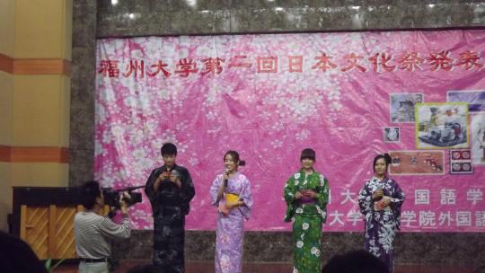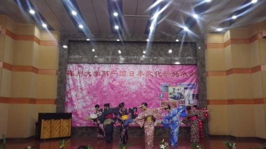 带来的乐器合奏中拉开序幕,优美动人的旋律让在场观众如痴如醉,将观众带入了美妙的音乐殿堂。剑道表演者以利落的动作、优美的姿势,赢得了观众的阵阵掌声。在日语串烧中,表演者们以优美的歌声、优雅的台风让在场观众感受到日语歌曲的魅力,目睹了日语系学生的风采。优美曼妙的日本舞既展示了和服的华丽美感,也诠释了日本女性典雅、端庄的独特气质,让观众惊叹不已。话剧表演同样精彩,《白雪姬》和《不可思议国》语言幽默,情节生动,虽风格不同,一个以诙谐幽默的语言和精彩到位的表演见长,一个则配以精彩的故事情节和夸张的舞蹈表演,却都让人耳目一新,引得现场尖叫声连连。配音表演又将晚会掀起了一阵高潮,演员们以生动到位、流利准确的发音博得了老师和同学们的热烈掌声。最后,日语系的同学和外教、老师共同演唱了活泼欢快的《ドラえもん》,为此次文化祭汇演画上了一个完美的句点。