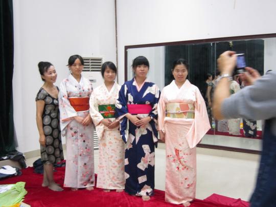 小时之久,期间整个排练厅气氛欢欣愉悦,同学们热情积极。最后,在兵頭惠夫人悉心专业的指导下,参与者身上的和服都穿出了浪漫的异国情调,典型的日本风格,堪称一场别出心裁的日本和服展示盛宴。本次来访,兵頭夫妇还向电影天堂