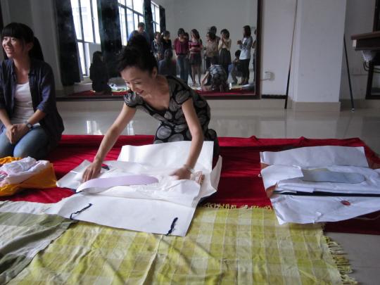 个同学积极加入其中。接下来就是正式的穿法展示。兵頭惠夫人一边耐心细致地解说一边为模特们穿上衣服,从里到外,从小到大,无一遗漏。细节方面也是极尽完美周到,腰带的系结,领子的固定,下摆的收放,幅度的调整都整理得漂亮美观、大方优雅。