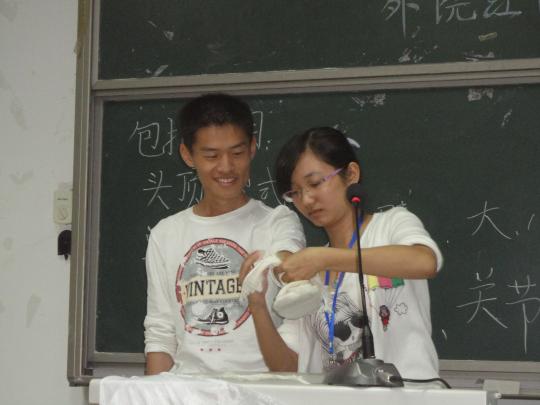 此次讲座针对运动急救和生活急救两大方面, 对急救知识展开阐述。首先,校红十字会培训部的同学以PPT的形式,深入浅出地讲解这两大方面的知识,如运动急救中的肌肉拉伤,腿骨疼痛,挫伤等,和生活急救中的中暑,烧伤处理,异物入眼等。主讲人以诙谐幽默的演讲方式和丰富的肢体语言,寓教于乐,牢牢吸引同学们的注意,并不时引发观众的开怀大笑,现场气氛十分活跃。在讲解完理论知识后,就进入了动手包扎的环节。校红十字会的同学为台下的观众分别示范了头顶帽式、单双眼、大小悬臂等八个项目的包扎,随后轮到观众亲手包扎的时间。台下的同学们边回忆边模仿着包扎的基本要领及重要步骤,开始进行包扎练习。校红十字会的同学也走入观众席为大家答疑解惑,并对同学们操作中遇到的问题予以相应的指导。9时许,在复习了一遍今晚所学内容之后,本次急救知识讲座落下帷幕。现场同学纷纷表示受益匪浅,深刻意识到推广、普及急救知识的重要性,学会急救等于学会自救和救人。