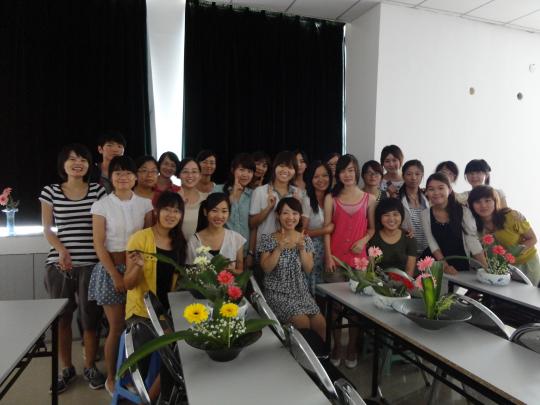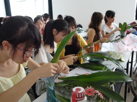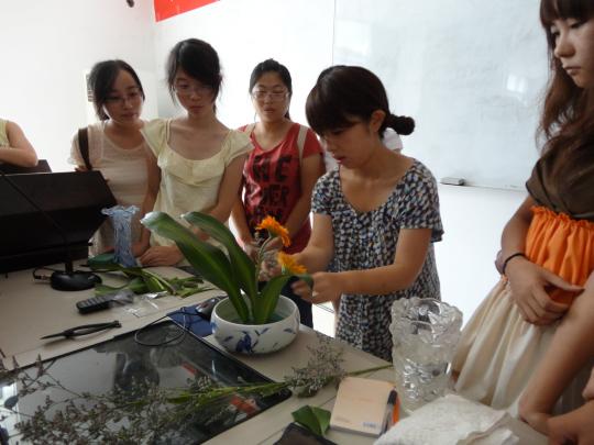 本次花道授课活动主要分为三个环节:活动伊始,挂本老师首先向同学们介绍了日本花道的基本知识并示范正确的插花艺术流程,带领同学走进花道文化的世界。其精彩的讲解和精湛的插花手艺赢得了同学阵阵赞叹之声。紧接着,同学们在挂本老师的指导下分为若干小组进行现学现插,更进一步了解、体会日本花道艺术的精髓。活动最后,同学们一一展示自己的作品,并和老师一起拍照留念。虽然活动时间有限,但在习得插花艺术基本技能后,有兴趣的同学今后仍可继续钻研,或向老师请教。