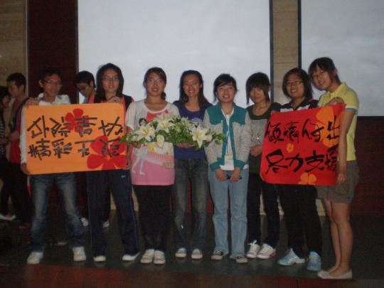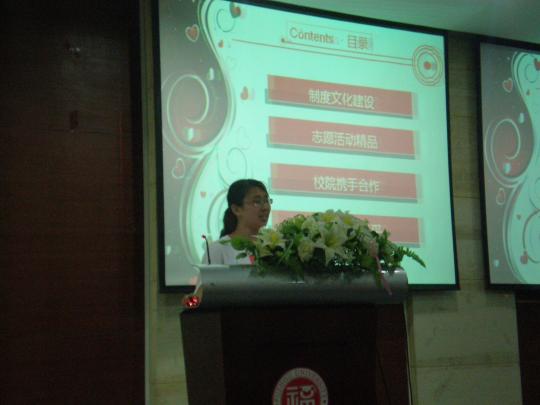 青协的王胜男同学在同学们高喊的“倾情奉献、尽力支援,外院青协、精彩无限”口号声中从容自信地走上讲台。在