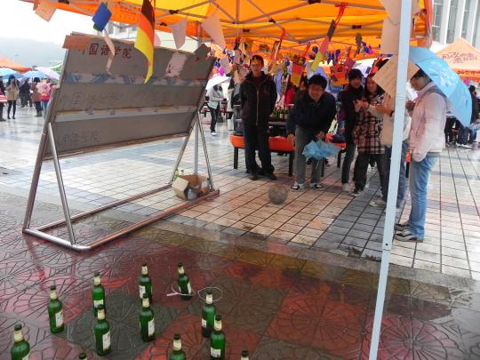 典雅神秘的哥特式建筑,轻松愉快的闯关足球赛,还有悠扬缭绕的萨克斯曲,给雨中的活动平添几分情趣。这些都是德语馆的同学精心策划准备的成果。满桌的啤酒瓶,也让我们感受到了慕尼黑啤酒节时德国人的热情洋溢。