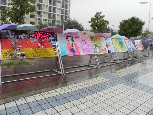 举办活动的帐篷对面,排列着一块块色彩鲜艳的展板。优雅古典的仕女,栩栩如生的动漫人物,充满特色的欧洲小吃和浪漫温馨的异国风情,在志愿者们的介绍下,仿佛纷纷来到同学们的眼前,陪伴大家一起度过这场文化盛宴。