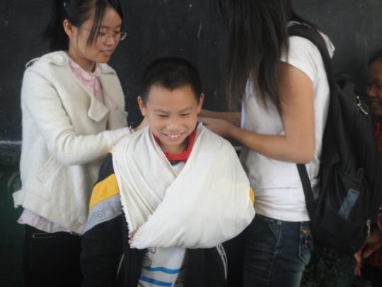 活动伊始,两名授课老师(红十字会部员)生动讲解意外突发(如火灾、地震)时如何有效地保护自己尽可能的不受伤、逃离现场,并详细介绍一些实用的生活自护小常识。在授课过程中,同学们聚精会神地听讲,还不时向老师提出问题,都得到老师的一一讲解。紧接着是知识抢答竞赛环节,问题刚一被抛出,同学们就迫不及待地高举起手,争着抢答,现场气氛紧张而热烈。同学们在竞争中学习知识,在知识中收获快乐! 最后,老师讲授了一些简易的包扎方法,在场的同学都积极参与,到讲台上协助老师做示范。而底下的同学则目不转睛地看着老师的操作步骤,跃跃欲试。示范完毕后,同学们分为两人一小组,互相进行包扎练习。