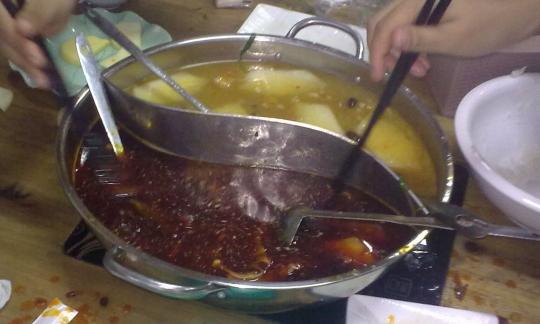日晚上七点,日语二班的同学们兴致勃勃的来到食景天火锅城,大家围成一桌,享受美食,尽情感受到了重庆火锅的麻辣醇香和鸳鸯火锅的半辣半鲜。同学们开怀畅谈,有说有笑,互相分享自己了解的饮食文化,十分热闹。给同学们印象最深的就是鸳鸯火锅了,它体现了一种兼容并蓄,求同存异的精神,让不同口味的大众能坐在一张饭桌上共同感受火锅文化。