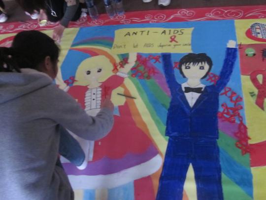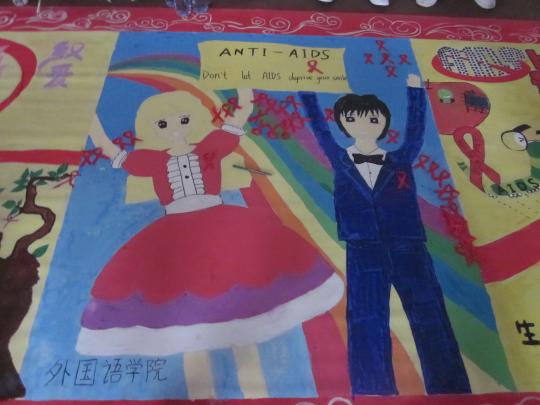 红十字会部员献唱的一曲《浏阳河》赢得了在场同学的阵阵喝彩。比赛场内,各学院同学在百米画卷上认真作画;比赛场外,同学们相继在写有“反对歧视,抗击艾滋,珍爱生命”的横幅上签下自己的名字,以实际行动来表达对活动的认可和支持。