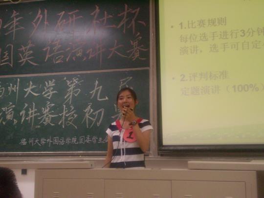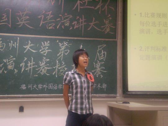 比赛以“___is my top concern”为题进行3分钟的定题演讲,来自各学院的37名选手依次登台,大秀英语口才。他们或是以慷慨激昂的标准美音见长,或是以甜美可人的地道英语见奇。他们声文并茂的演绎,幽默生动的语言,让现场气氛始终火爆,观众席中时时爆发出热烈的掌声和笑声。比赛最后,徐朝晖老师对选手们的表现进行了点评和总结,他希望同学们把这次比赛看作一次锻炼自我的机会,并鼓励大家今后继续努力。