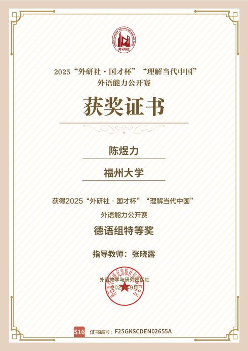德语系学子陈煜力荣获全国德语组特等奖,陈乙娆同学荣获全国德语组一等奖。
