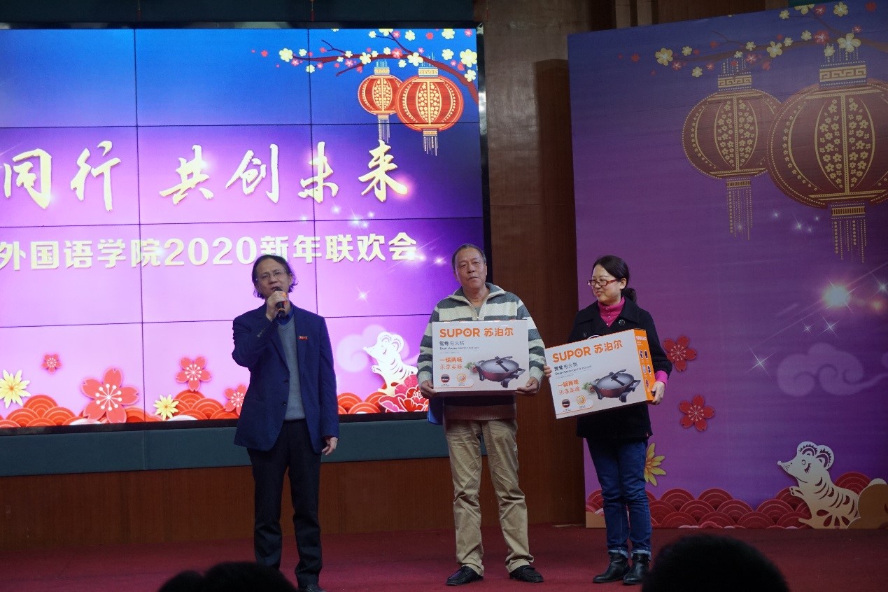 联欢会中,学院特别安排了2019年学院退休教师荣休仪式。钟晓文副院长代表全院师生向荣休的教师代表献上礼物,表达了学院对荣休教职员工辛勤工作、奉献岗位的深深敬意。