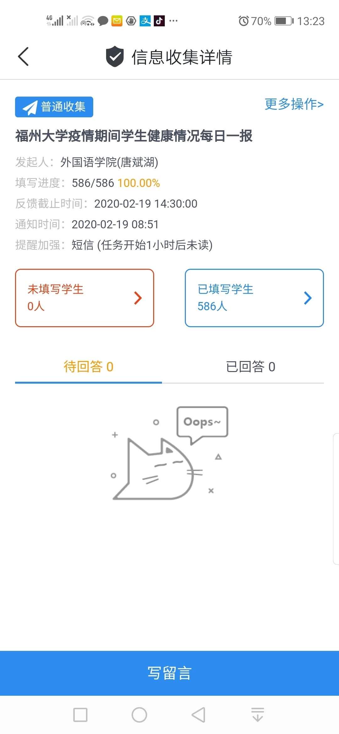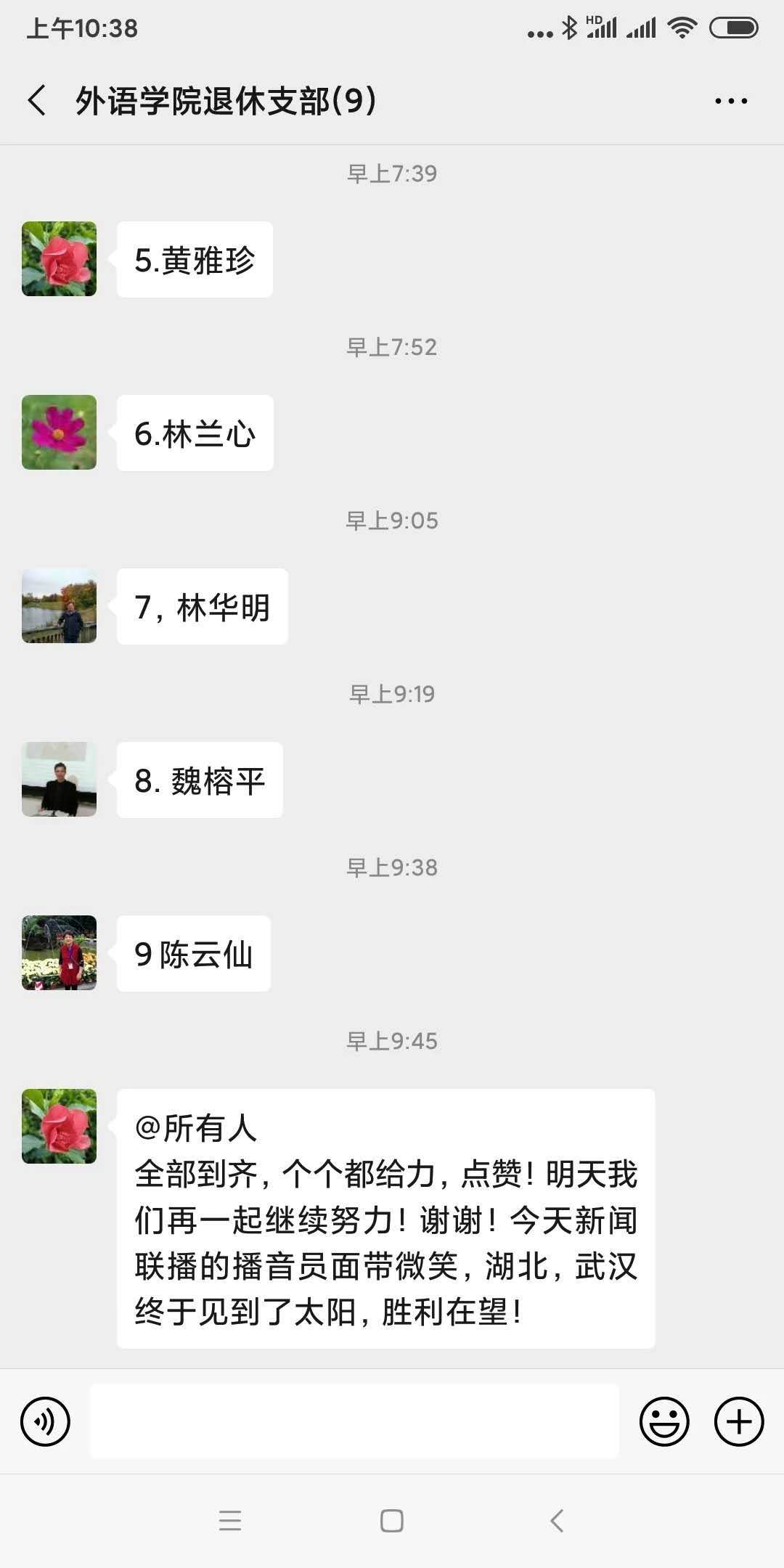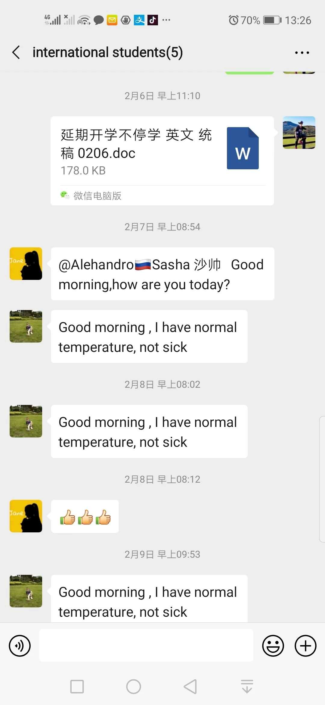 二是落实每日排查。学院现有140名教职员工(含1名楼管)、47位离退休教师(其中41名退休教师由学院负责管理)和723名各类学生(其中本科生638名,研究生85名),包括在外访学、参军、生病等原因休学的学生,离校待考和延长修习年限的学生,港澳台学生,外籍留学生和外籍华侨学生等。学院严格落实师生健康信息“日报告、零报告”制度,确保疫情防控全覆盖,通过电话、邮件、微信等方式,每天及时落实健康动态的排查和系统信息填报,动态掌握师生所在位置和健康状况(目前尚在外地的教师21人,其中国外4人、省外3人),准确掌握湖北籍师生、途经(接触)湖北人员,“到闽”“返闽”等多项信息,并做好科普和居家医学观察提醒。对外籍教师(8名)、在境外访学学生(11名)、港澳台(23名)和留学生(1名)等安排专人联系,确保不漏人,异常情况及时反馈、特殊情况密切跟踪。