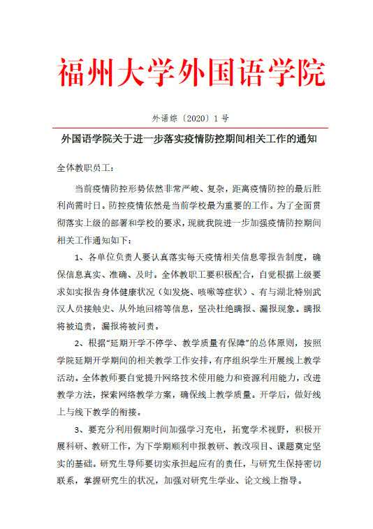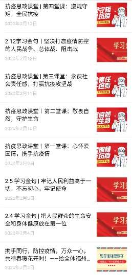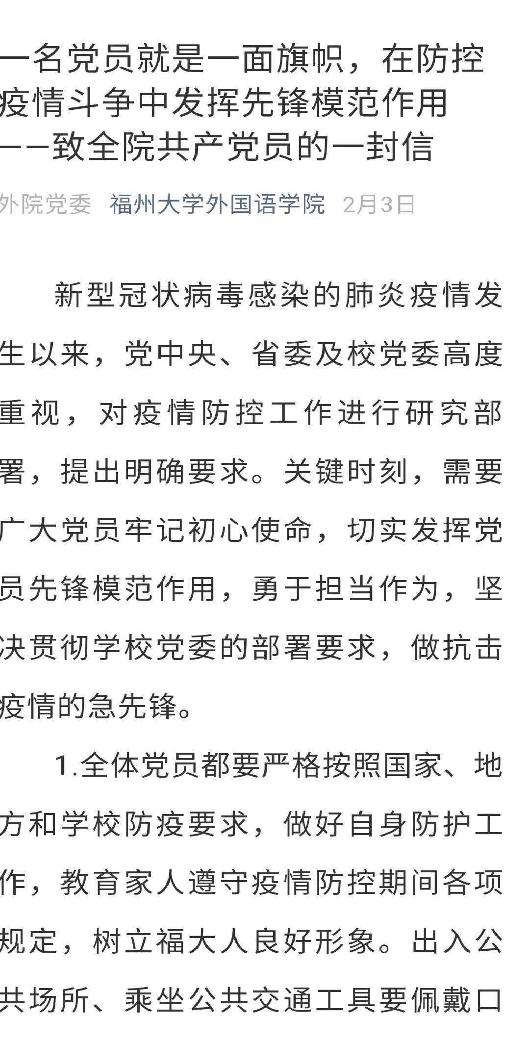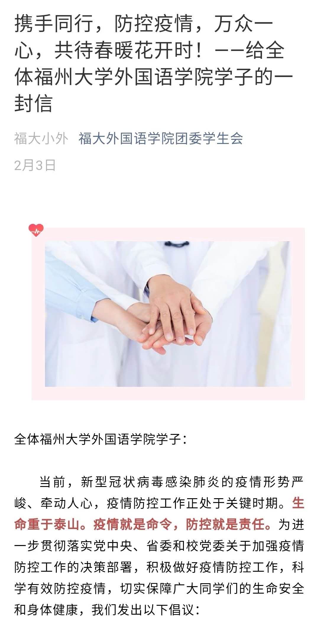 学子的一封信》,号召全体师生携手同行,共同抗击疫情。推送《致全院共产党员的一封信》,号召全院党员牢记初心使命,切实发挥党员先锋模范作用,在防控疫情工作中勇于担当作为。