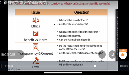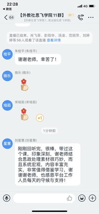 两位老师的分享各持续1个半小时,收获现场点赞1万多次,受到参会教师的一致好评,有助于老师们进一步加深对外语课程思政教学的认识和理解。 (俞秀红 供稿)