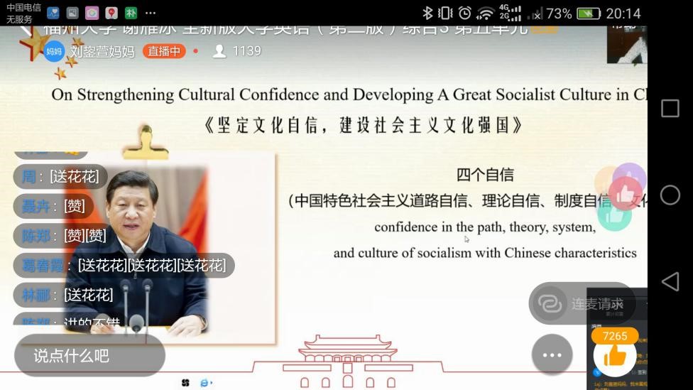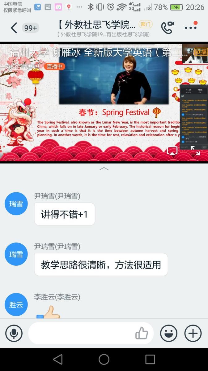 直播内容分别为上海外语教育出版社《全新版大学英语(第二版) 综合教程》第三册第4单元和第5单元。谢雁冰老师紧紧围绕单元主题“Giving Thanks”进行课程思政教学设计。依照不同的教学环节插入社会主义“四个自信”的思政教学元素。通过介绍和对比西方传统节日“感恩节”的历史文化以及各种中国传统节日当中的感恩文化,挖掘中国传统文化当中的精髓,引导学生以社会主义核心价值观为导向,重读中国经典文化,增强青年学生的民族自信心和自豪感。在课文讲授过程中,对表达感谢的方式进行讨论,通过口语和书面两种不同形式,指导学生对疫情期间各行各业做出不平凡贡献的普通人表达谢意,引导他们感受到跨越文化障碍的共同情感体验。