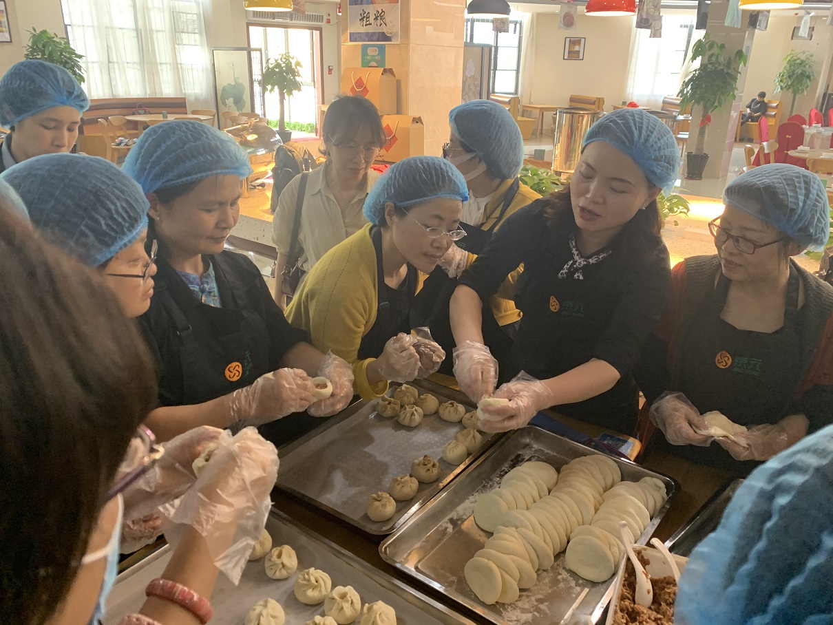 活动现场热闹非凡,香气四溢。餐厅师傅早已将包子馅和包子皮都准备好了。大家都热情高涨,积极参与,忙得不亦乐乎。大家认真聆听餐厅师傅传授包包子经验,并在师傅的耐心指导下学着包包子,将包子包得既漂亮又饱满。整个过程欢声笑语不断,一排排包子很快就摆满了一个个盘子。