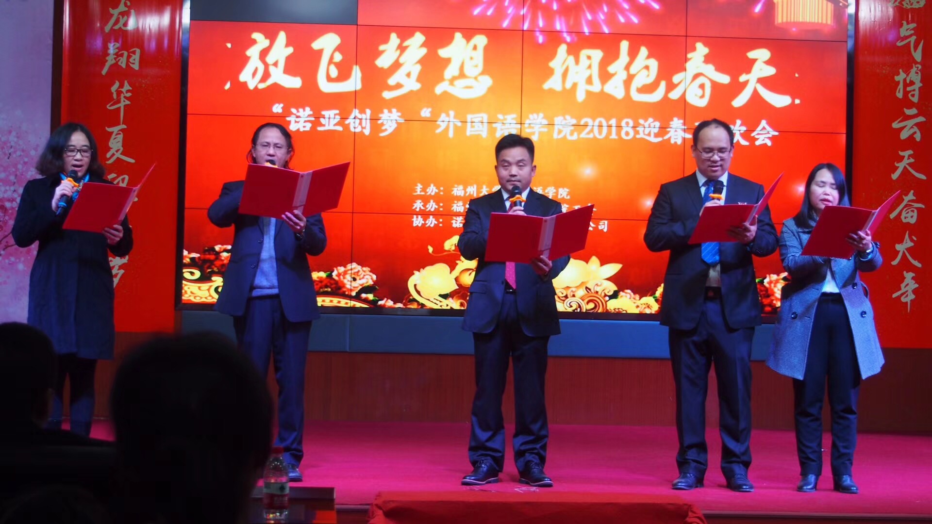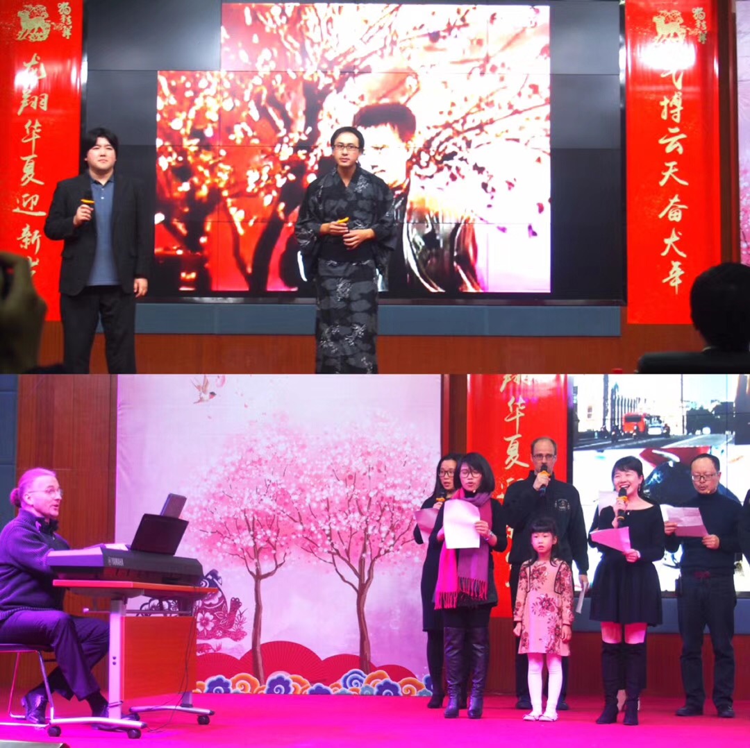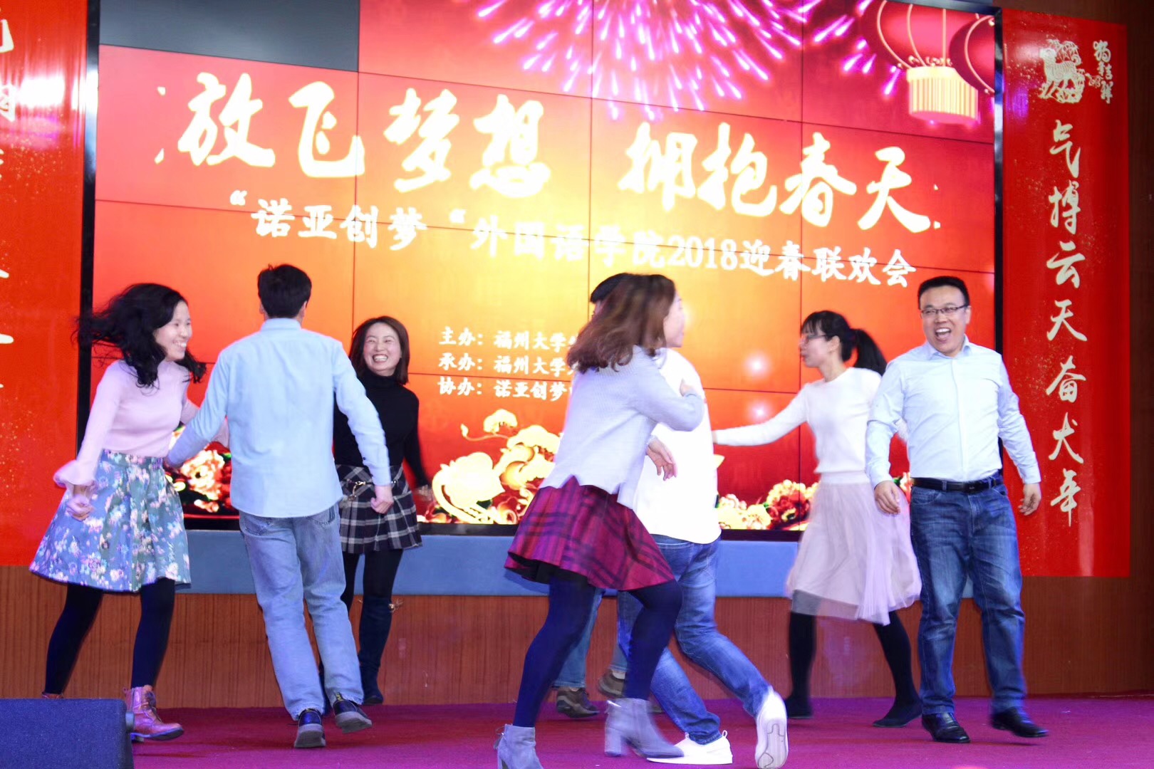 ,加油!》,引领全体教职工回顾过去一年外院各方面取得的可喜成果,展望充满希望的新愿景!其他合唱歌声动听,古典舞姿曼妙,最后青年教师们跳起欢快热烈的美国传统方块集体舞,大家一起拍掌,期间不断有老师即兴加入,更是把整台联欢的气氛推向最高潮,连外教老师都连呼跳得过瘾!
