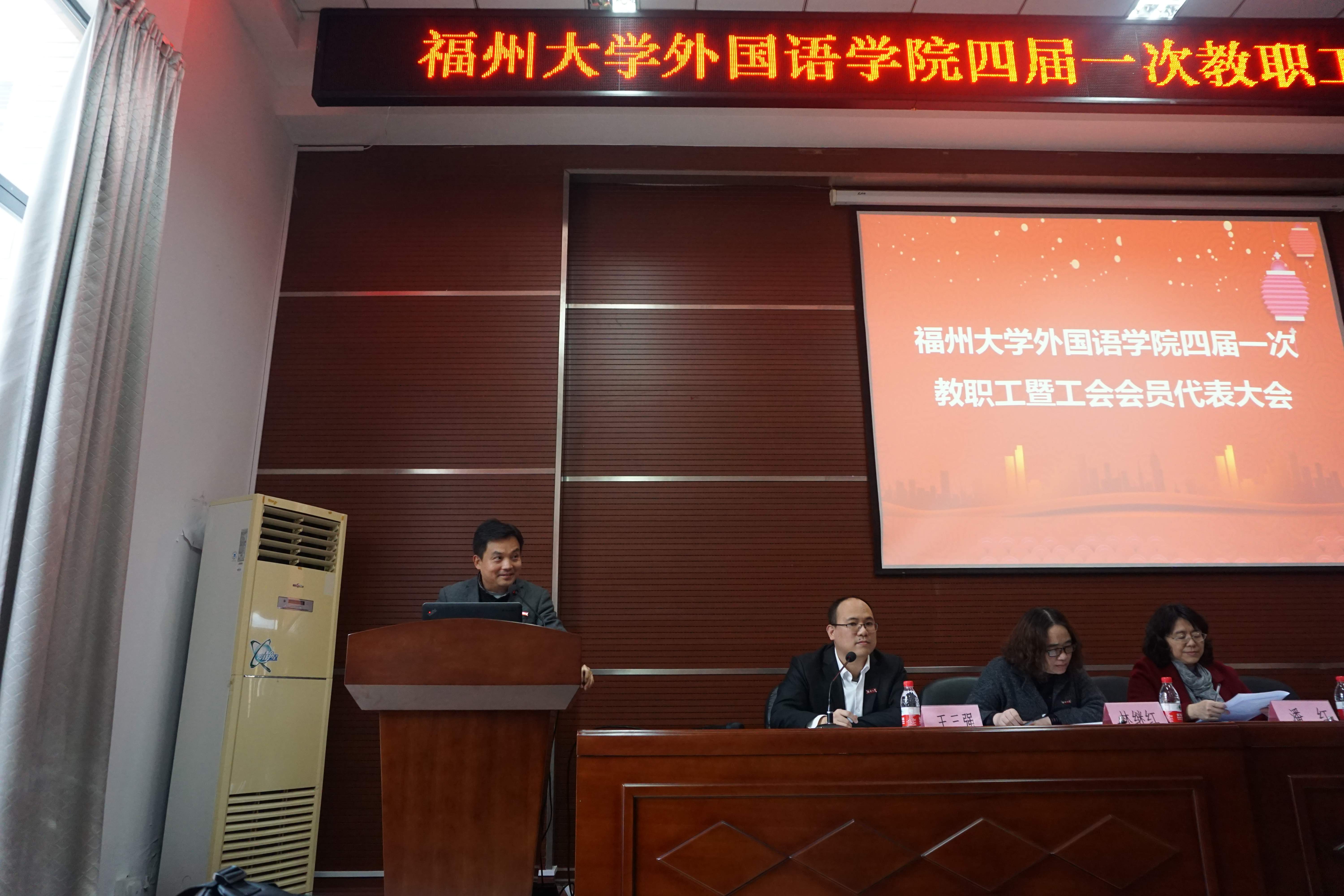大会由院党委副书记王三强同志主持。首先,校工会倪朝霞主席代表校工会向本次大会表示祝贺并肯定学院近年来取得的成绩。陈伟民书记致开幕词,潘红院长做学院工作报告,院工会王平主席做学院工会工作报告,钟晓文副院长做了学院绩效工资实施细则(修改稿)的报告,院办公室主任庄颖慧做《学院财务工作报告》等。