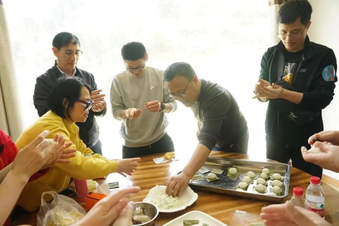 晌午将至,老师们“上得讲堂,下得厨房”,人人动手制作青团,一起野炊享受户外野餐,欢声笑语,好不热闹。