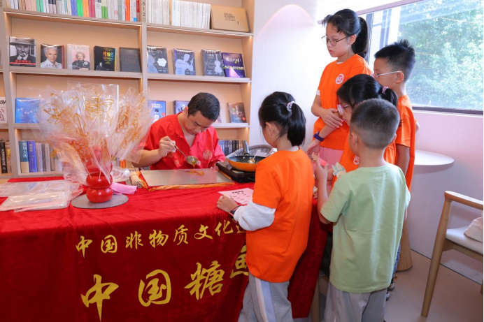 糖画,一种有温度的艺术。小朋友们亲眼目睹非遗传承人孙博轩老师以勺为笔、以糖为画,一笔一画绘制出形态各异的糖画作品,感受中华文化的独特韵味。