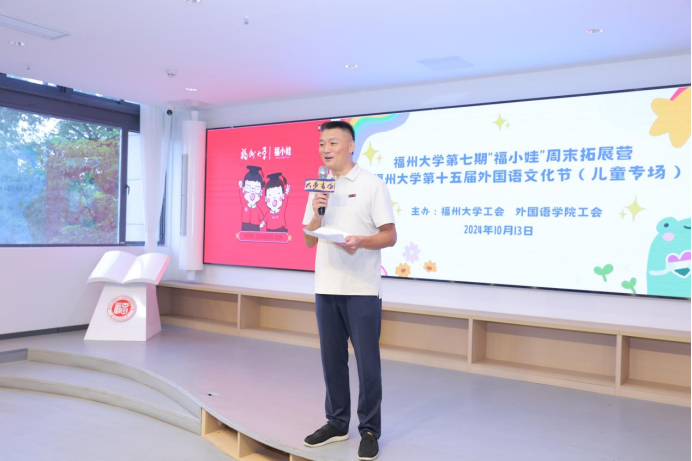 校工会常务副主席王群老师发表了热情洋溢的讲话。他首先对到场的家长、老师、同学们、小朋友们表示热烈的欢迎,并介绍了举办“福小娃”周末拓展营与外国语文化节的重要意义。王群老师特别感谢电影天堂
