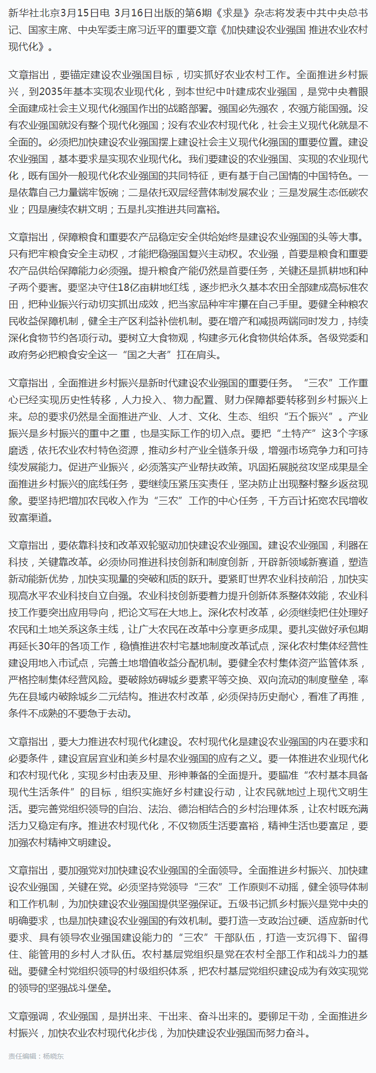 《求是》杂志发表习近平总书记重要文章《加快建设农业强国 推进农业农村现代化》