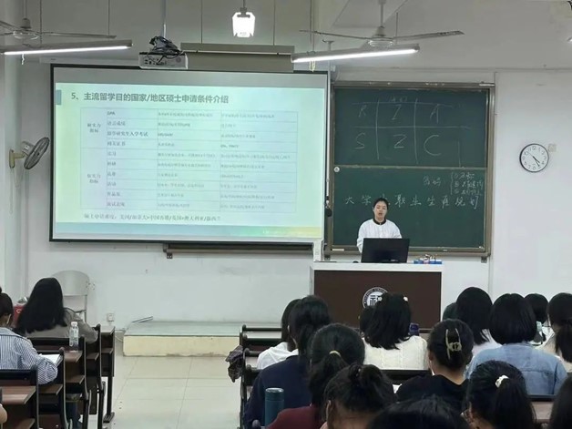 分享会伊始,张密玉校友以学习为例强调生涯规划的重要性,提醒同学们注重大学四年的平时积累。通过分析当今本科生的毕业出路和国内考研竞争形势,张老师详细介绍了出国留学的优劣,谈及电影天堂
