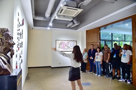 接着,研修班团队到达沈锡纯美术馆,在场馆工作人员与老师学生的陪同讲解下,外宾们欣赏书法与绘画作品、感受中华优秀传统文化之美。