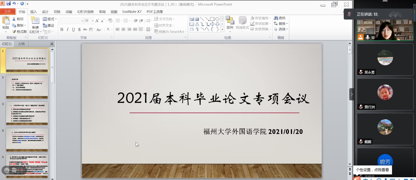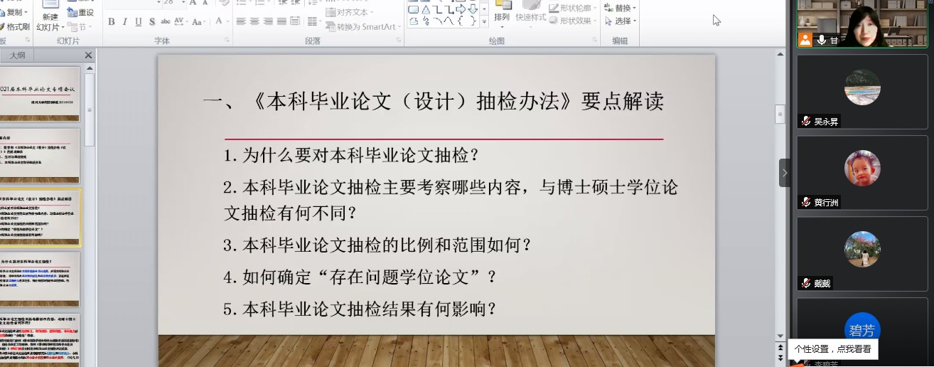 通过腾讯会议平台召集英日德三个专业全体老师于2021年1月20日晚20:00召开了一次线上2021届本科毕业论文专题会议,由院长助理甘振翎主持。会议首先是对教育部的《本科毕业论文(设计)抽检办法(试行)》进行要点解读,其中包括:本科毕业论文抽检的目的、抽检主要考察的内容以及与博士硕士学位论文抽检的区别、抽检的比例和范围、如何确定“存在问题学位论文”以及抽检结果的影响这五个方面的内容;其次,甘振翎助理与在会老师共同讨论与制定了一些针对本科毕业论文质量管理与整改的措施,并邀请潘红教授、陈小慰教授、付磊老师分享本科毕业论文指导经验;最后,英日德老师们就本科毕业论文指导过程中出现的问题与困难进行了提问与讨论,进一步明确了本科毕业论文质量的要求与重要性。