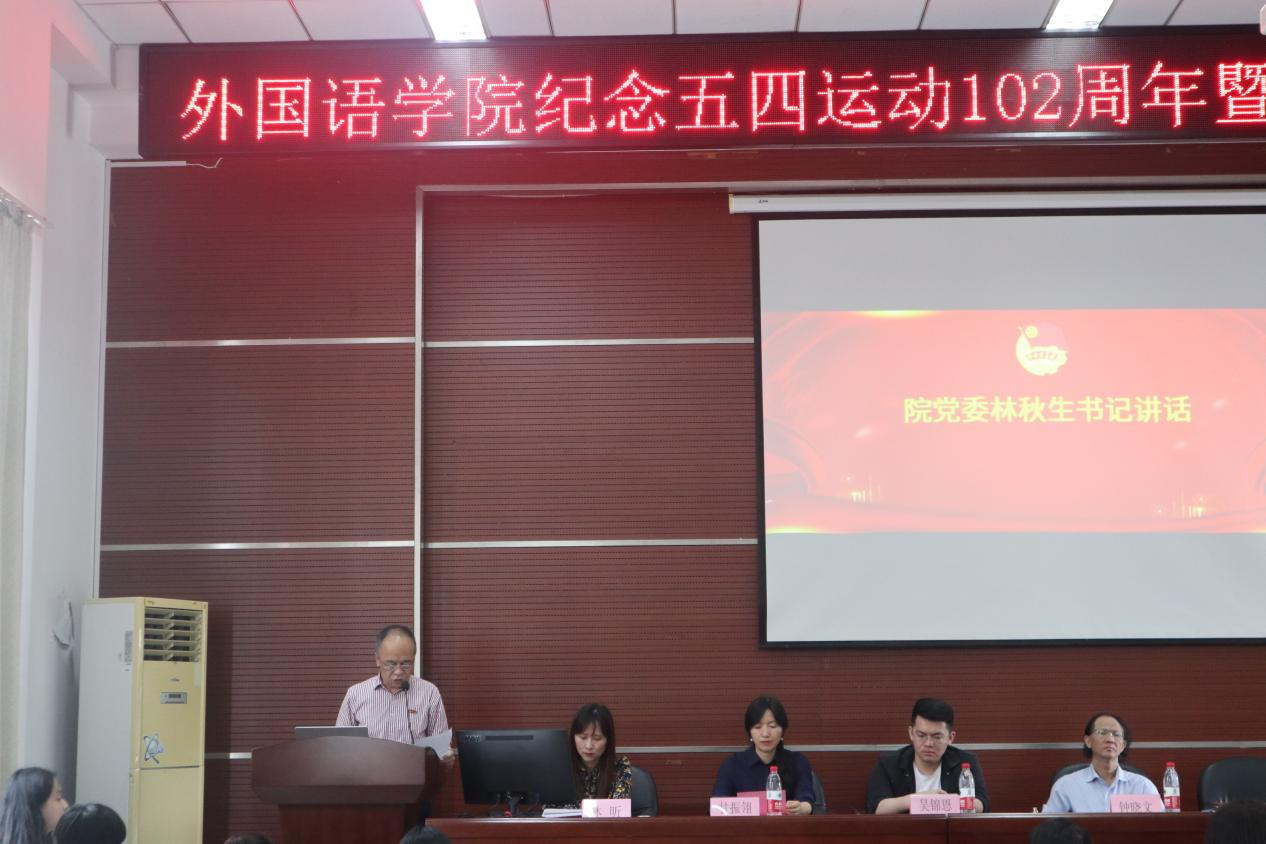 纪念五四运动102周年暨五四表彰大会。福建省三行文化发展有限公司总经理吴锦恩先生、学大教育咨询有限公司福州分公司总经理张家精先生、学院党委林秋生书记、院长钟晓文教授、副院长林继红教授、院长助理甘振翎副教授、院长助理王建丰博士、学院师生代表及2018级、2019级本科生、研究生参加了此次表彰大会。