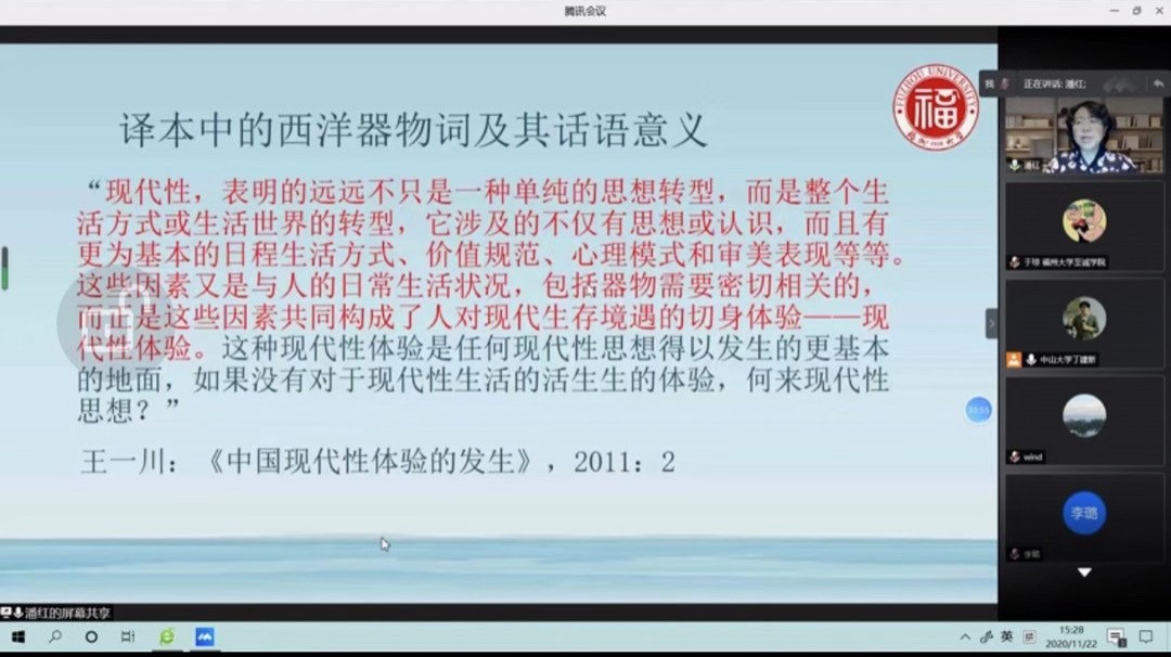 潘红教授应邀于11月22日下午3点通过腾讯会议做了题为“《迦因小传》中西洋器物的话语意义”的发言。潘红教授提出:器物是人为之作,在其物质功用之外还承载着深厚的文化寓意。器物是一个时代文明程度的标志物,体现生产力程度、言说一代人的审美特征、生活方式和价值理念,因而也是一种修辞符号,指向其背后的价值体系和制度文化。在杨紫麟和包天笑1901 年合译的英国通俗小说《迦因小传》中西洋器物形成了一个醒目的系列文学形象,连贯成一个独特的修辞话语场,参与了译本话语意义的建构。以批评话语研究视角分析《迦因小传》对西洋器物的译介特点,阐述其亦新亦旧的思想意识,揭示晚清文学翻译对社会意识重构的潜在作用。