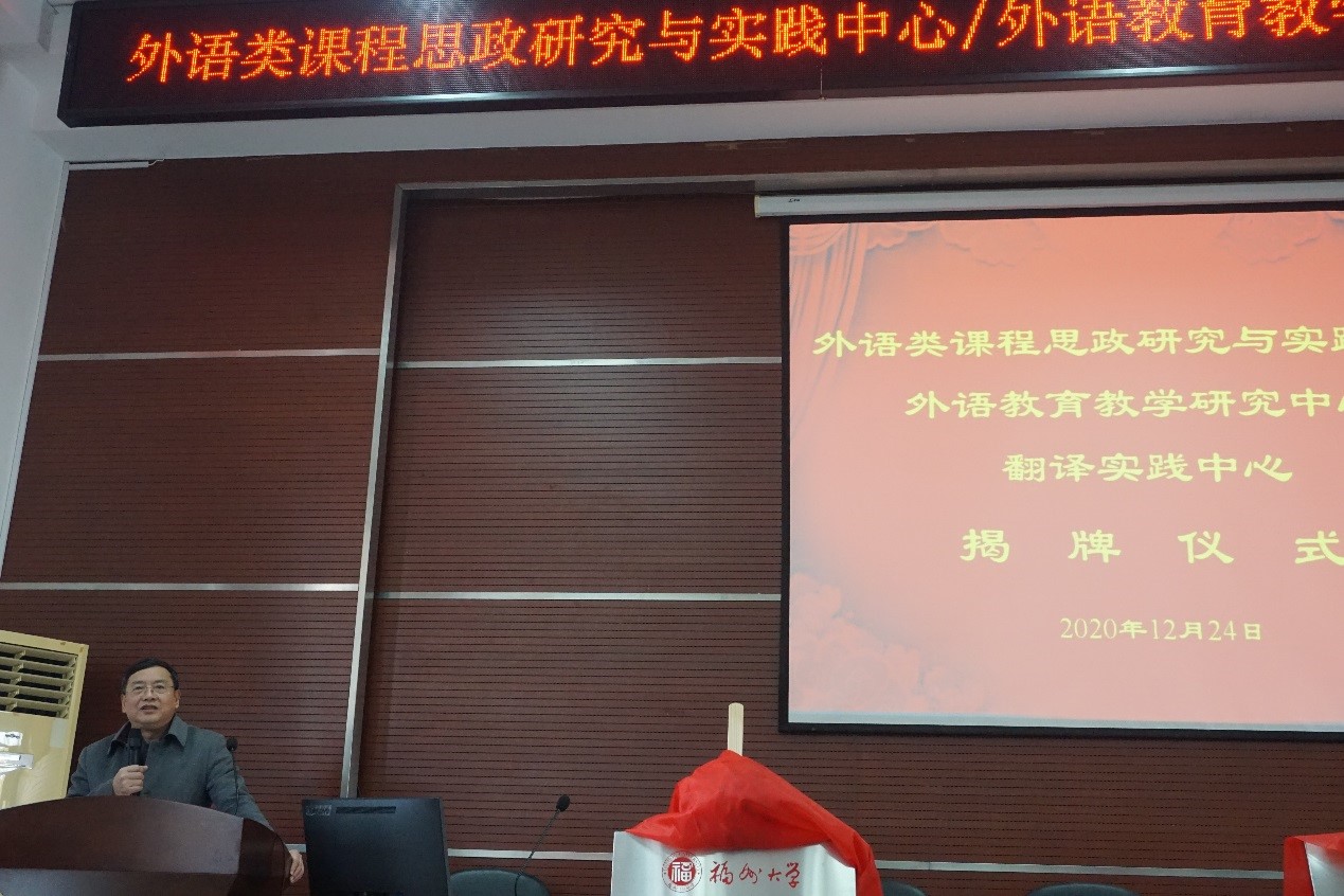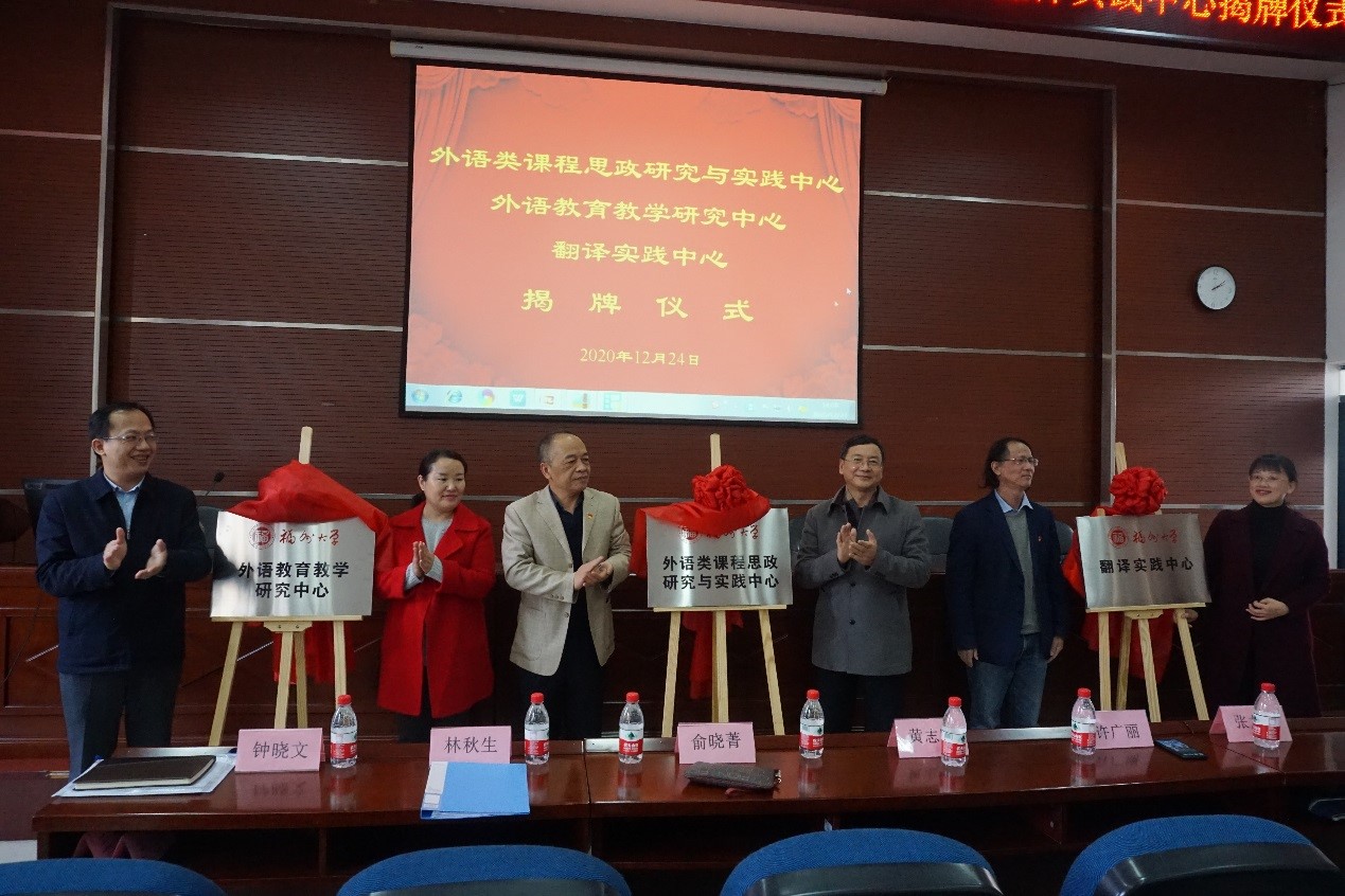 在学院三楼会议厅举行外语类课程思政研究与实践中心、外语教育教学研究中心、翻译实践中心等三个中心揭牌仪式。黄志刚副校长、省教育厅高教处许广丽调研员、教务处张友坤副处长、研究生院俞晓菁主任等出席了揭牌仪式,学院班子成员和全体教师参加揭牌仪式。揭牌仪式由钟晓文院长主持。