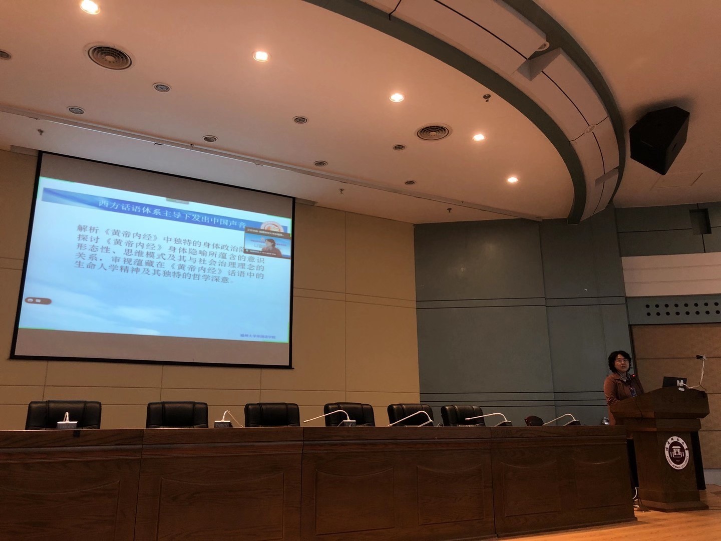潘红教授应邀在会上做了题为“《黄帝内经》身体隐喻中的政治理念”的主旨发言。她指出:《黄帝内经》是中国第一部医学典籍。《黄帝内经》在认知生命现象、构建中国医学理论体系的过程中,基于自然界、生命认知、人类社会经验及哲学思想中各种已知的范畴和概念,以取象比类的思维方式创造出了一整套隐喻话语,形成了独特的中医隐喻语言。本文以话语研究的视角解析《黄帝内经》中独特的身体政治隐喻,特别是从社会官职隐喻等入手,探讨《黄帝内经》身体隐喻所蕴含的意识形态性、思维模式及其与社会治理理念的关系,审视蕴藏在《黄帝内经》中的生命人学精神及其独特的哲学深意。《黄帝内经》所蕴含的传统中国医药话语内涵和表征的和谐性哲学理念也辐射到政治统治理念和社会意识形态之中。