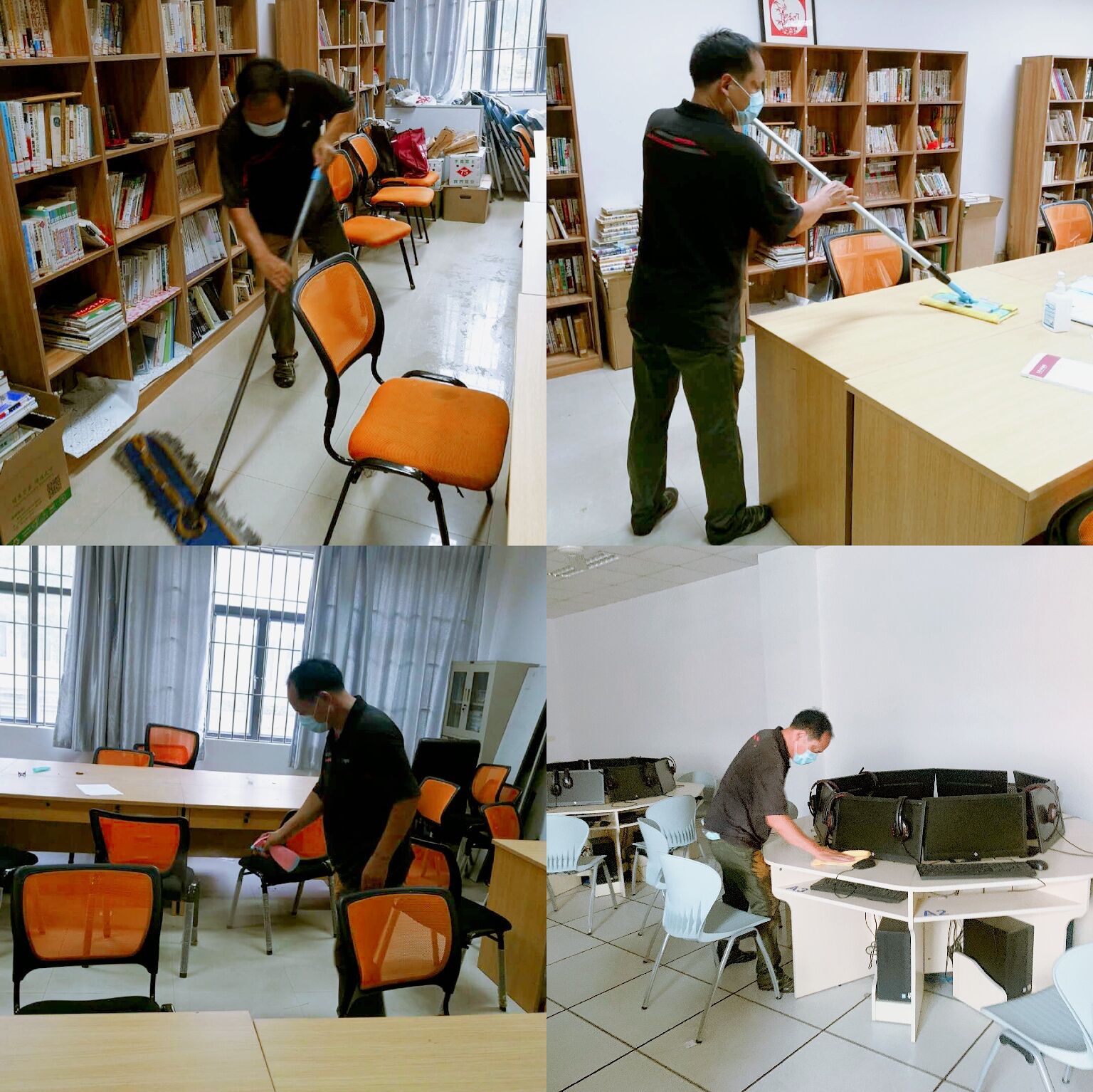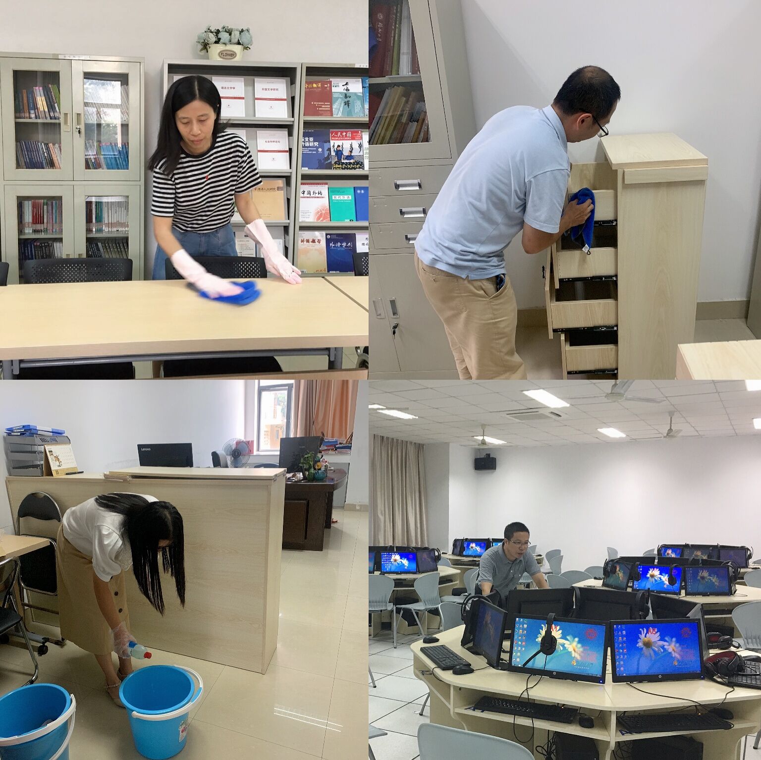 为迎接新学期广大电影天堂 师生返校复课,8月27日下午,在院领导班子部署下,院办公室组织开展全院楼内卫生清洁与消毒工作,学院楼内的所有教室、语音室、教研室、资料室、读书角、休息室、各行政办公室都进行了卫生清洁与消毒,所有公共区域的门把手、扶手、桌面、地板都用一定配比的消毒水进行擦拭和喷洒,所有楼内的空调设备都清洗完毕。学院所有行政人员及楼管参与了此次院内消毒及清洁工作。同时,学院语音室教室的设备由院实验中心提前进行检查测试,为学院正常的复课工作做好准备。
