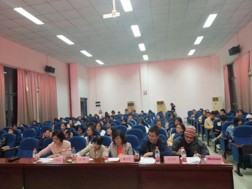 三楼会议室顺利举办,英语系外教Michael博士、英语系副主任吴永昇副教授、学科竞赛赛事总负责人戴力芬副教授、李金云博士和余艳老师担任本次比赛的评委。外教Michael担任提问嘉宾和点评嘉宾,他的机警提问和精彩点评获得满堂喝彩。
