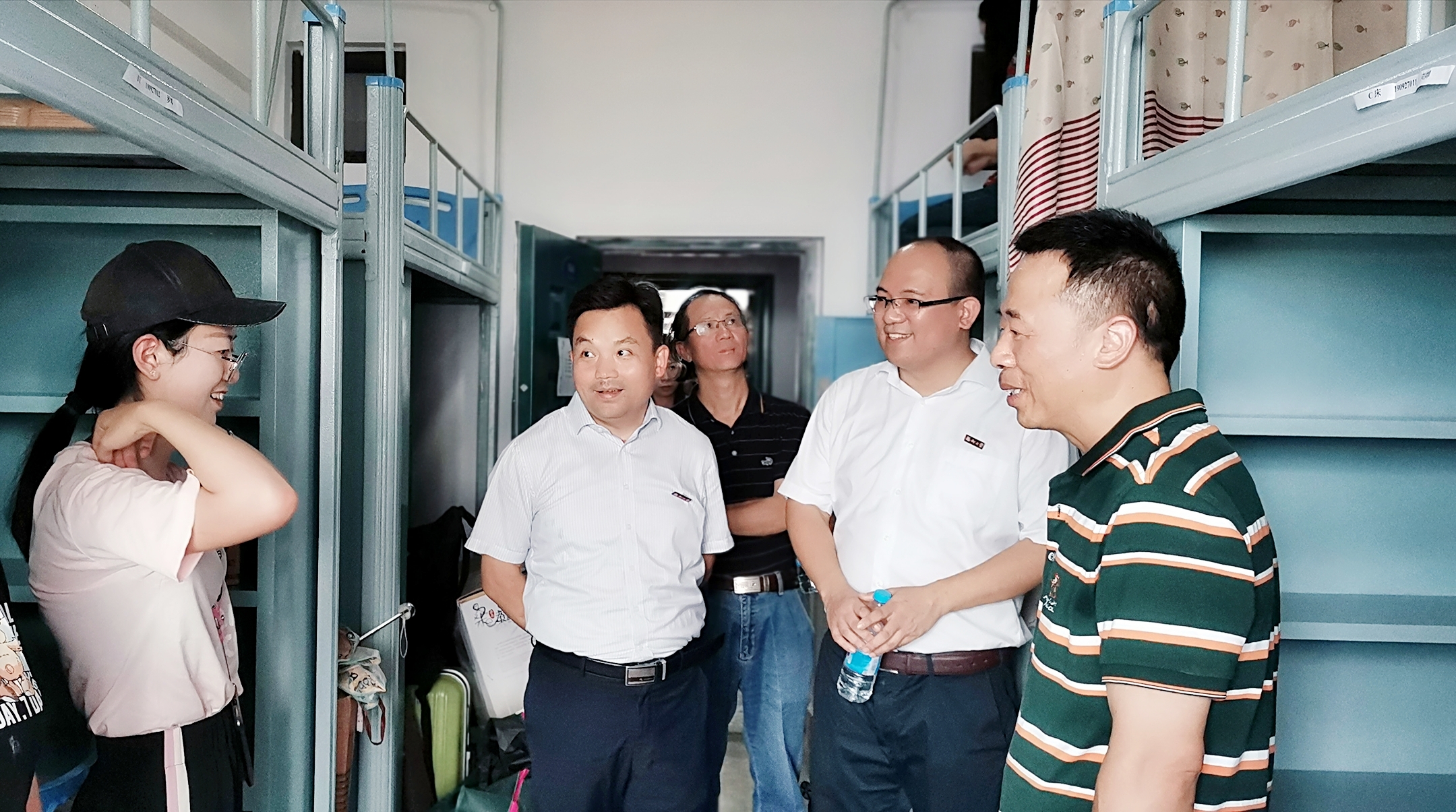 迎新现场,了解迎新工作进展及新生报到情况,并深入新生宿舍,与新生及新生家长亲切交流,嘱咐学院相关部门负责人要尽一切所能为新生及家长提供好服务。