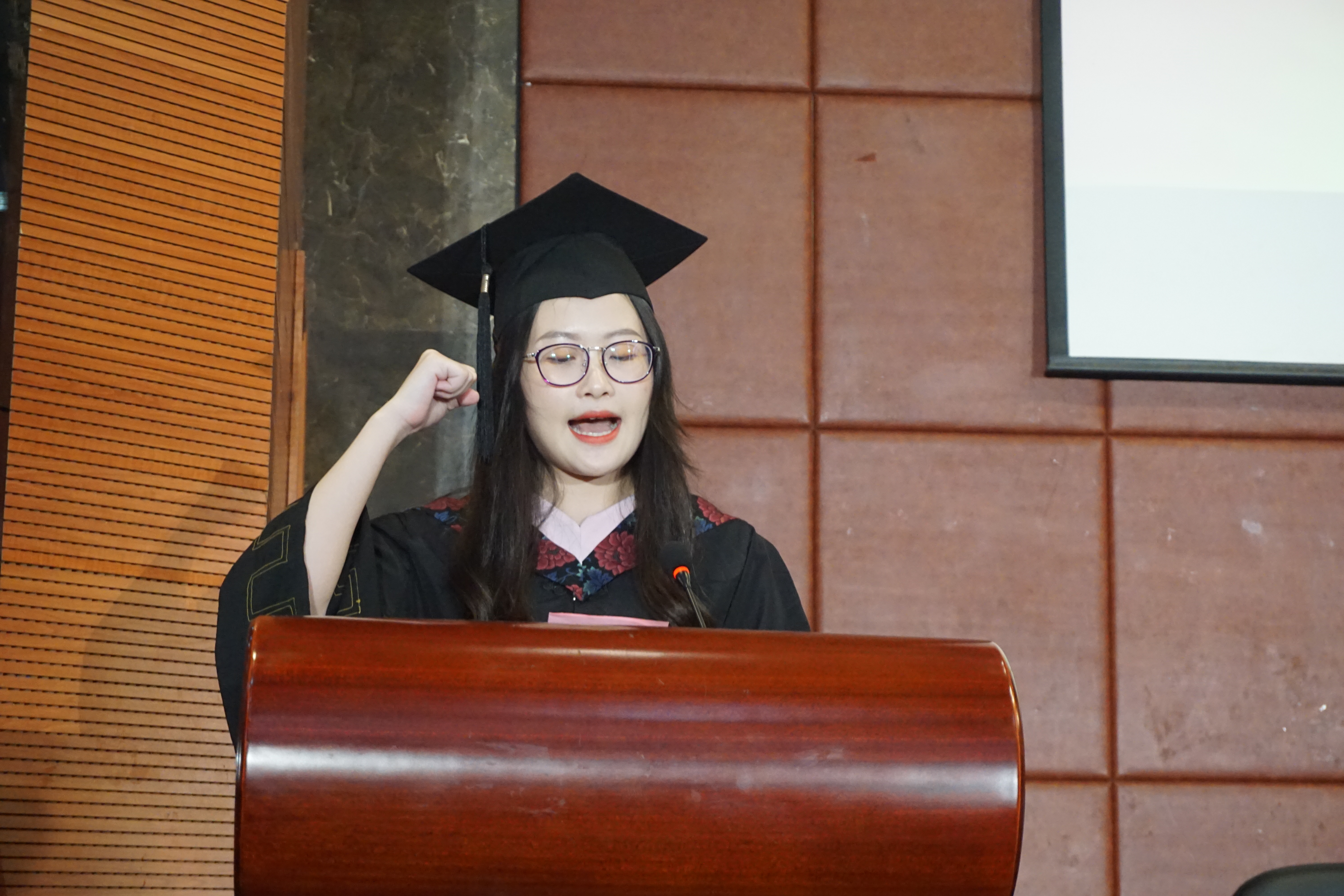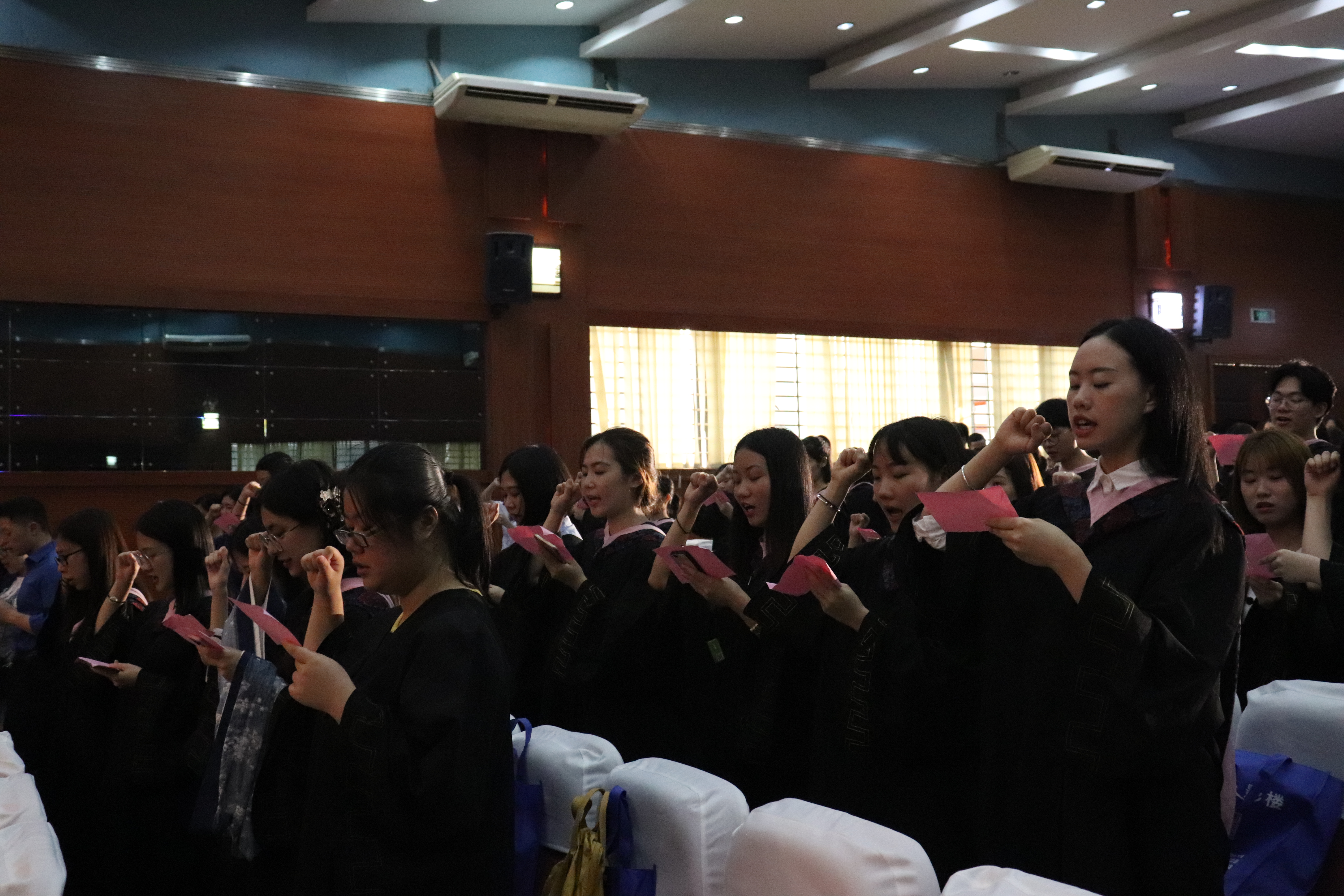 “铭记母校教育,谨遵师长教诲……”,毕业生们全体起立,由领誓人赖慧宁带领大家进行庄重的毕业宣誓,用响亮的宣誓给此次毕业典礼画上了圆满的句号。